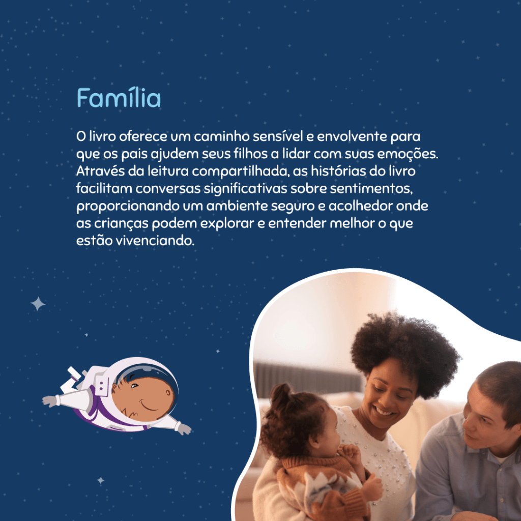 O livro oferece um caminho sensível e envolvente para que os pais ajudem seus filhos a lidar com suas emoções. Através da leitura compartilhada, as histórias do livro facilitam conversas significativas sobre sentimentos, proporcionando um ambiente seguro e acolhedor onde as crianças podem explorar e entender melhor o que estão vivenciando.👪