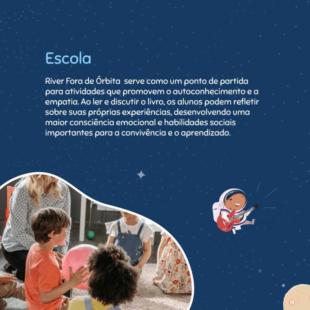 River Fora de Órbita serve como um ponto de partida para atividades que promovem o autoconhecimento e a empatia. Ao ler e discutir o livro, os alunos podem refletir sobre suas próprias experiências, desenvolvendo uma maior consciência emocional e habilidades sociais importantes para a convivência e o aprendizado.🏫