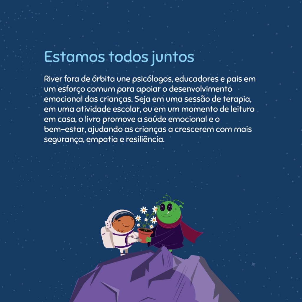 River fora de órbita une psicólogos, educadores e pais em um esforço comum para apoiar o desenvolvimento emocional das crianças. Seja em uma sessão de terapia, em uma atividade escolar, ou em um momento de leitura em casa, o livro promove a saúde emocional e o bem-estar, ajudando as crianças a crescerem com mais segurança, empatia e resiliência.